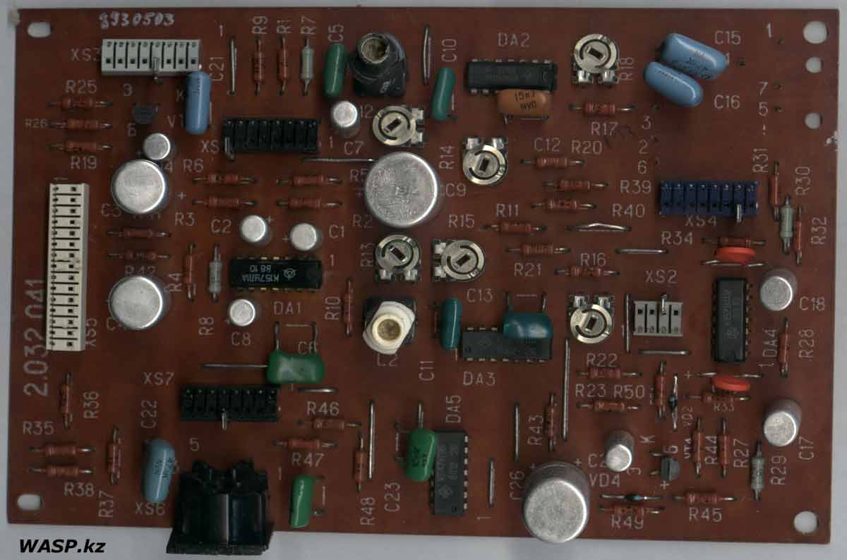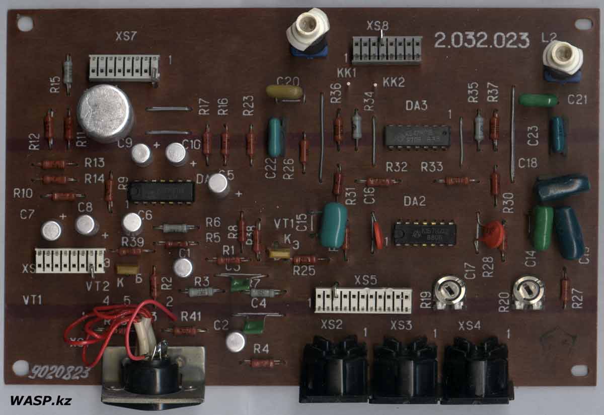 Плата – усилитель воспроизведения. Плата расположена на самом низу. На ней маркировка 2.032.041 и еще от руки – 3930503. На плате распаян один внешний разъем – линейный вход на задней панели. Микросхемы: К547КП1Б – 3 штуки, К157УЛ1А, К157УД2. Плата включает в себя корректирующий и линейный усилители.