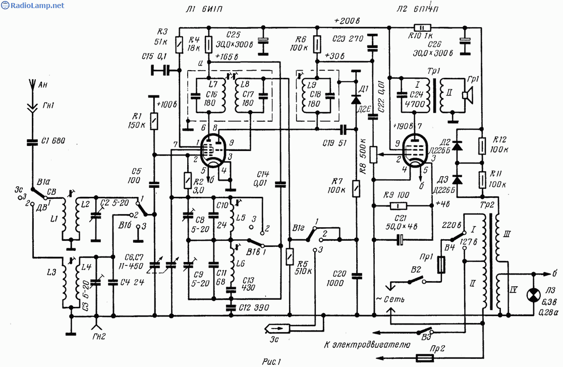 Лaмпы in triod: 6Ф3/5П, 6П18/43П, 6П13C/31C/41C, 6LR8, 6KY8.