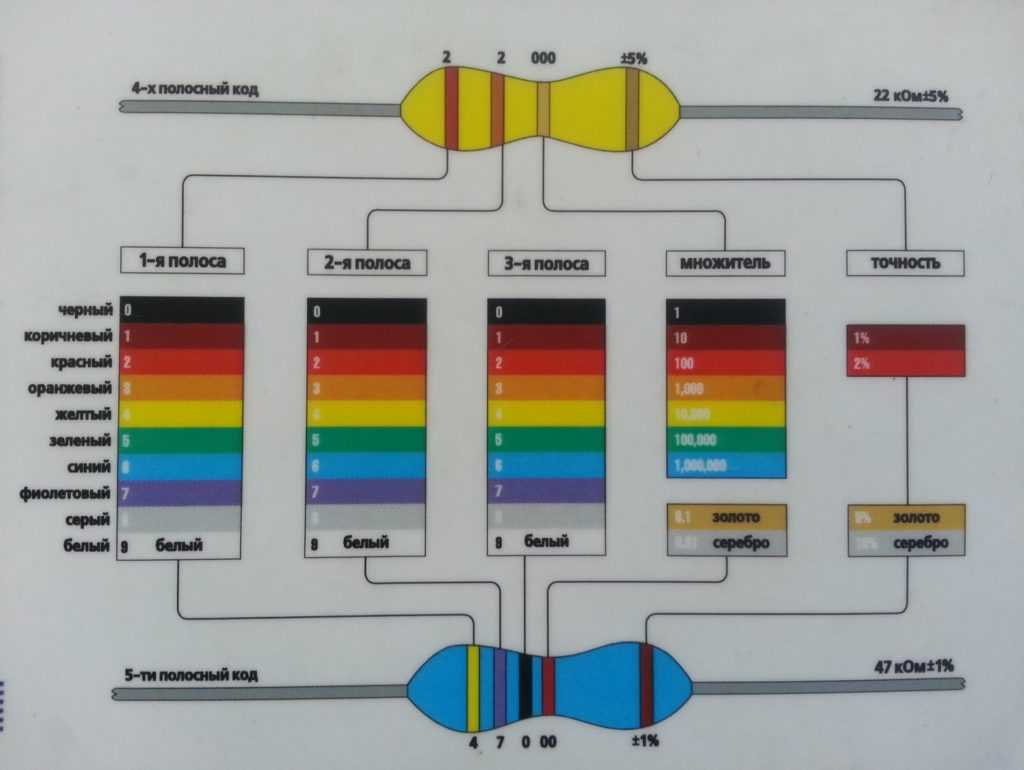 Для определения номинала элемента, кроме знания основ физических процессов, необходимо знать технологию цветового обозначения номиналов электронных компонентов.