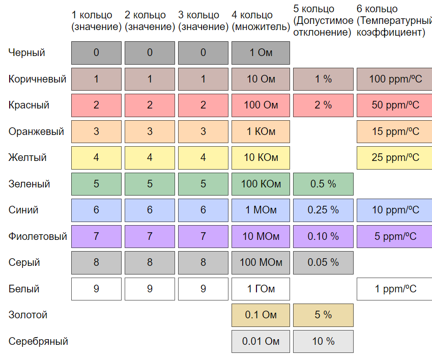 Таблица расшифровки маркировки резисторов с 5 полосками