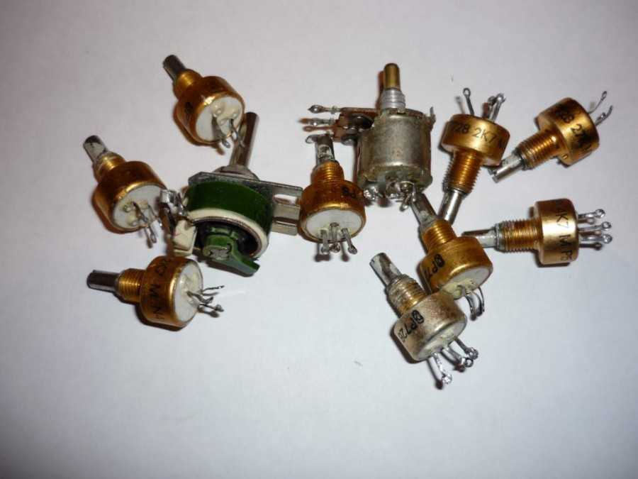 Компоненты переменного потенциометра оснащены тремя и более выводами, и механизмом перемещения ползунка – токосъемника. Диапазон изменения простирается от нуля до максимума, ограниченного установленным номиналом.