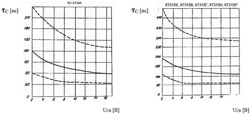 Рис. 8. Зависимости постоянной времени обратной связи по коллекторной цепи τС от величины напряжения коллектор-база при высокой частоте для некоторых транзисторов семейства КТ315.