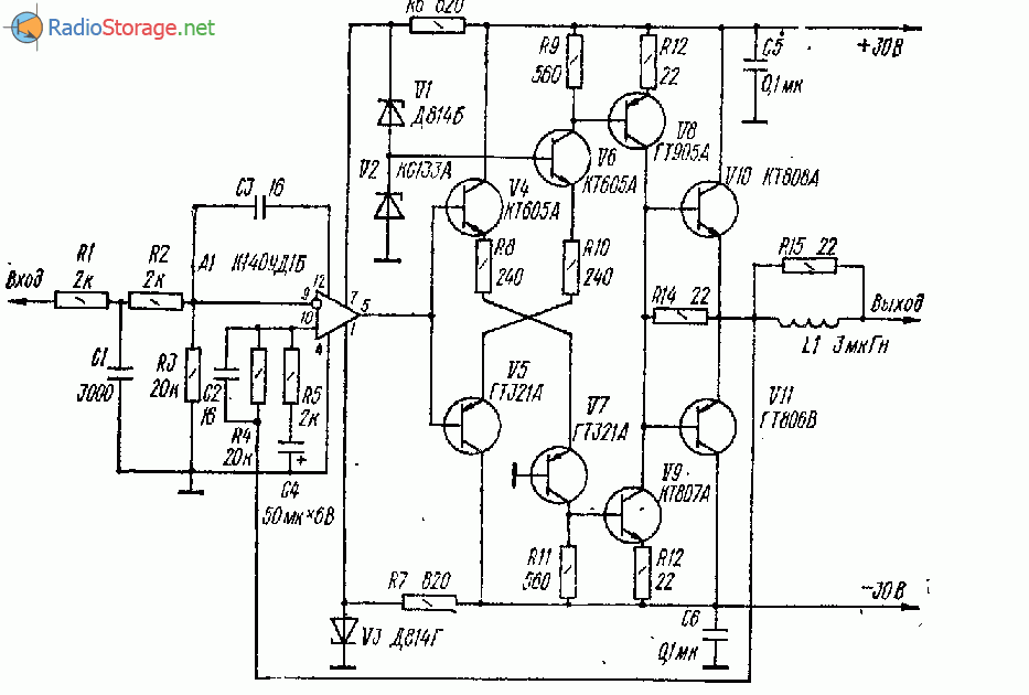 Включенные в их эмиттерные цепи резисторы R12, R13 создают местные ООС по току, что вместе со стабильными токами смещения и определяет высокую термостабильность усилителя в целом. Ток покоя транзисторов, V8, V9 равен 30 мА (при температуре 60 °С он возрастает до 50 мА). Частота среза этой ступени усилителя 130 кГц.