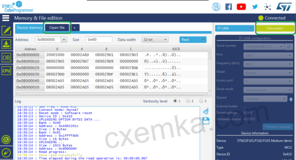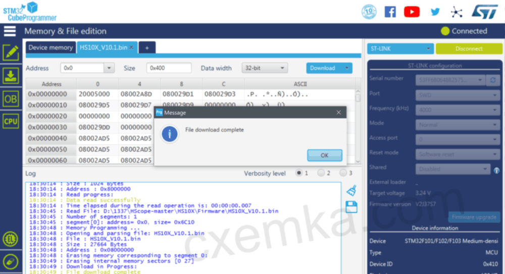 NRST) и после подключения отпустить. Нажать Connect, подключение должно пройти успешно (в случае необходимости обновить прошивку стлинка)