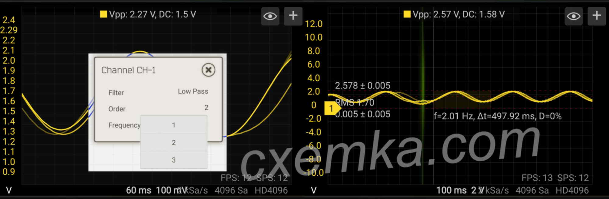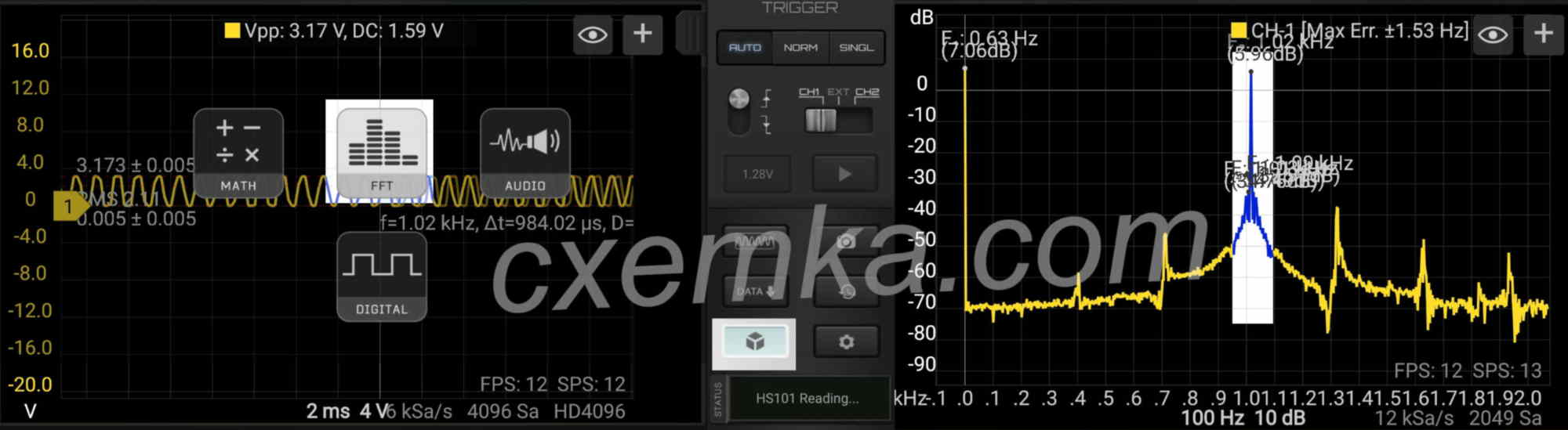 У этой программы нет привычной измерительной сетки, да и экран слишком большой для снятия скриншотов, но зато есть встроенный вольтметр амплитудных значений и частотомер, что частично компенсирует указанный выше недостаток.
