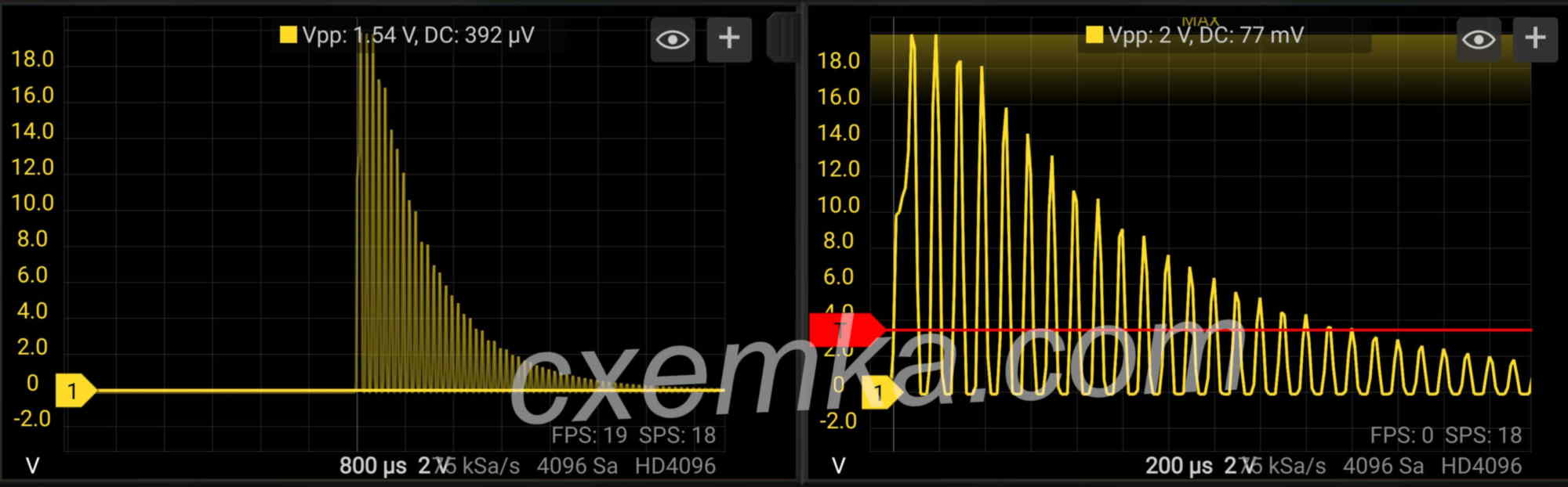 Вот этот затухающий сигнал, достаточно чёткий, частота 44 кГц: