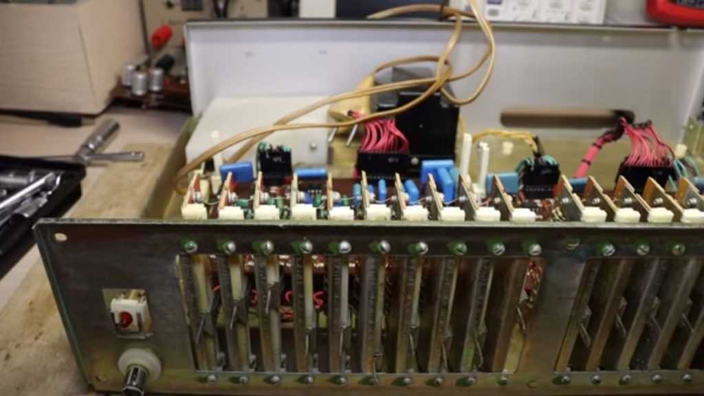 Крышка туго, но сдвигается назад. Теперь мы видим все внутренности эквалайзера. Внутри эквалайзера Прибой ЭС все разбито на блоки. Белой полиэтиленовой крышкой закрыт вход электропитания — кнопка включения и выключения, предохранитель и один конденсатор типа К Через всю глубину корпуса от кнопки включения идет металлический стержень на переднюю панель. Отсюда провода идут на трансформатор, который закрыт металлическим экраном. На экране бумажная наклейка, на ней схема трансформатора и название ЛБ4.